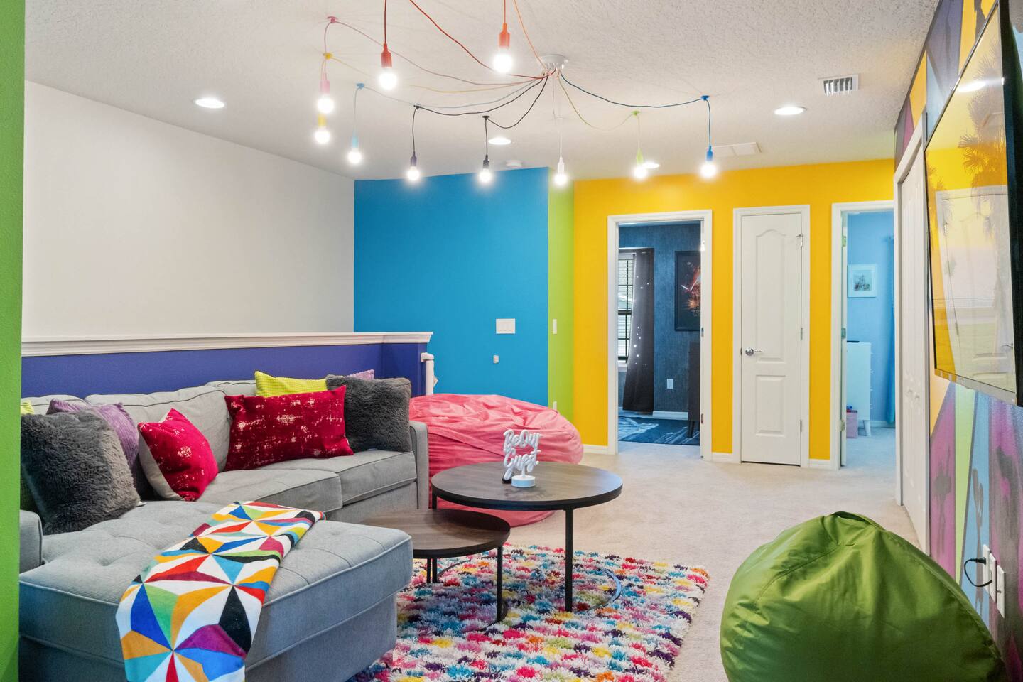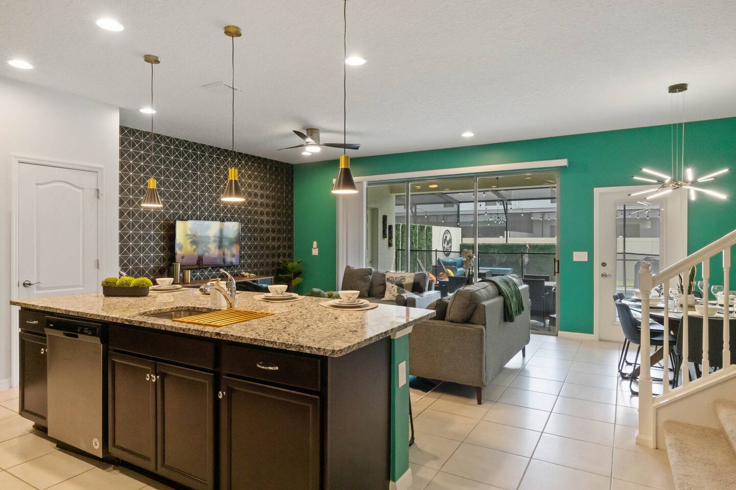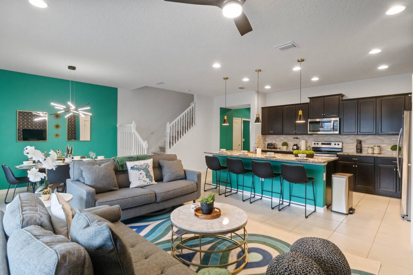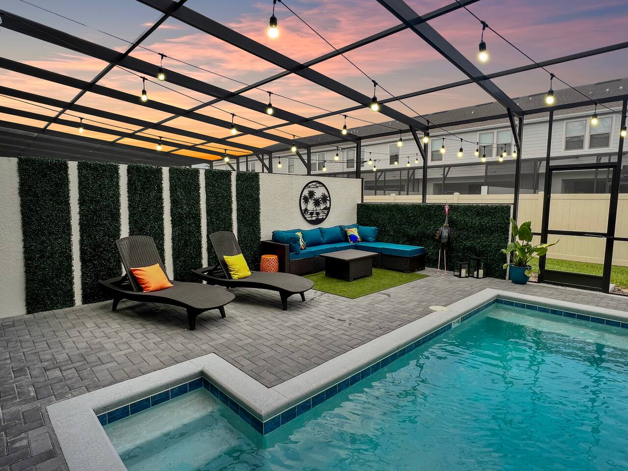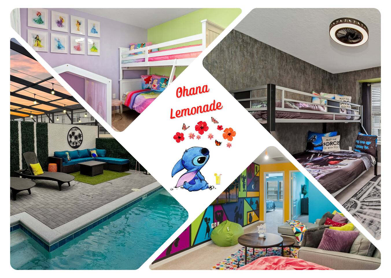 Prime Location – Just minutes from Disney, and Margaritaville! - Private Heated Pool (pool heat at additional cost)– Enjoy your own 4ft deep pool or float in the lazy river at the resort - Family-Friendly & Spacious – 5 bedrooms, 4.5 bathrooms, plus a loft for movie nights - Resort-Style Living – Access to a water complex, tiki bar, sports courts, and more! - Fully-Equipped Kitchen & Home Comforts – Cook meals, do laundry, and feel at home. Welcome to Ohana Lemonade, a beautifully designed vacation retreat in the exclusive Windsor at Westside Resort. This home offers everything you need for a magical stay, including five stylish bedrooms, a fully equipped kitchen, and a cozy loft perfect for movie nights. The spacious open-concept living and dining area features plush seating, a large Smart TV, and modern decor, creating a welcoming space to unwind. Whether you're enjoying a family dinner at the dining table or lounging on the sectional after a day at the parks, this space is designed for relaxation. The gourmet kitchen is fully stocked with top-of-the-line appliances, including a refrigerator with an ice maker, a coffee maker, a blender, and all the cookware you need. Whether you're whipping up a quick breakfast before heading out or preparing a family feast, you’ll have everything at your fingertips. Each bedroom is designed for maximum comfort. The primary suite boasts a king-sized bed, a private en-suite bathroom, and a Smart TV, making it the perfect retreat. Additional bedrooms feature queen beds, themed bunk beds for the kids, and cozy decor that adds to the home’s charm. Every room has a Smart TV, remote-controlled ceiling fan, and plush bedding to ensure a restful night’s sleep. For even more entertainment, the upstairs family loft is the perfect place to gather. Equipped with a Smart TV and comfortable seating, it’s an ideal spot for movie nights, board games, or simply unwinding after a long day. Step outside to your private splash pool, where you can soak up the Florida sun, enjoy an al fresco meal, or unwind in the lounge area. The patio features a dining table, lounge chairs, ambient string lighting, and a cabana bath for added convenience. Whether you're cooling off in the water or simply enjoying the warm Florida evenings, this outdoor space is designed for fun and relaxation. Want even more fun? The resort’s lazy river, huge pool, fitness center, and tiki bar are just minutes away! Where you will sleep: Bedroom 1: King bed with attached full bathroom Bedroom 2: Queen bed with attached full bathroom Bedroom 3: Twin over twin bunk bed Bedroom 4: Twin over full bunk bed Bedroom 5: Queen Bed (downstairs) For traveling families: -Baby gate for stairs -Pack and Play -Kids plates and utensils -Booster Seats -High Chair -------------------------------------------------------------------------------------------------------------------------------------------------------------------------------------- To keep everything above board and ensure a safe and secure stay for everyone, we've got a few quick steps for you to breeze through: - Verify Yourself: You might be asked to show us your official ID – don’t worry, it’s just to make sure you’re you! - Must be 25 years or older to rent our home! - Confirm Contact Info: Double-checking your digits so we can reach you easily if needed. - Security Screening: Hop through our verification portal – think of it as your VIP pass to a fantastic stay. Rest assured, your info is as safe as houses with us! We won’t be selling, sharing, or handing it off to anyone else. Once you’re all set and verified, we’ll shoot over your check-in instructions faster than you can say “vacation time!” So let’s get this party started – your dream getaway awaits!
